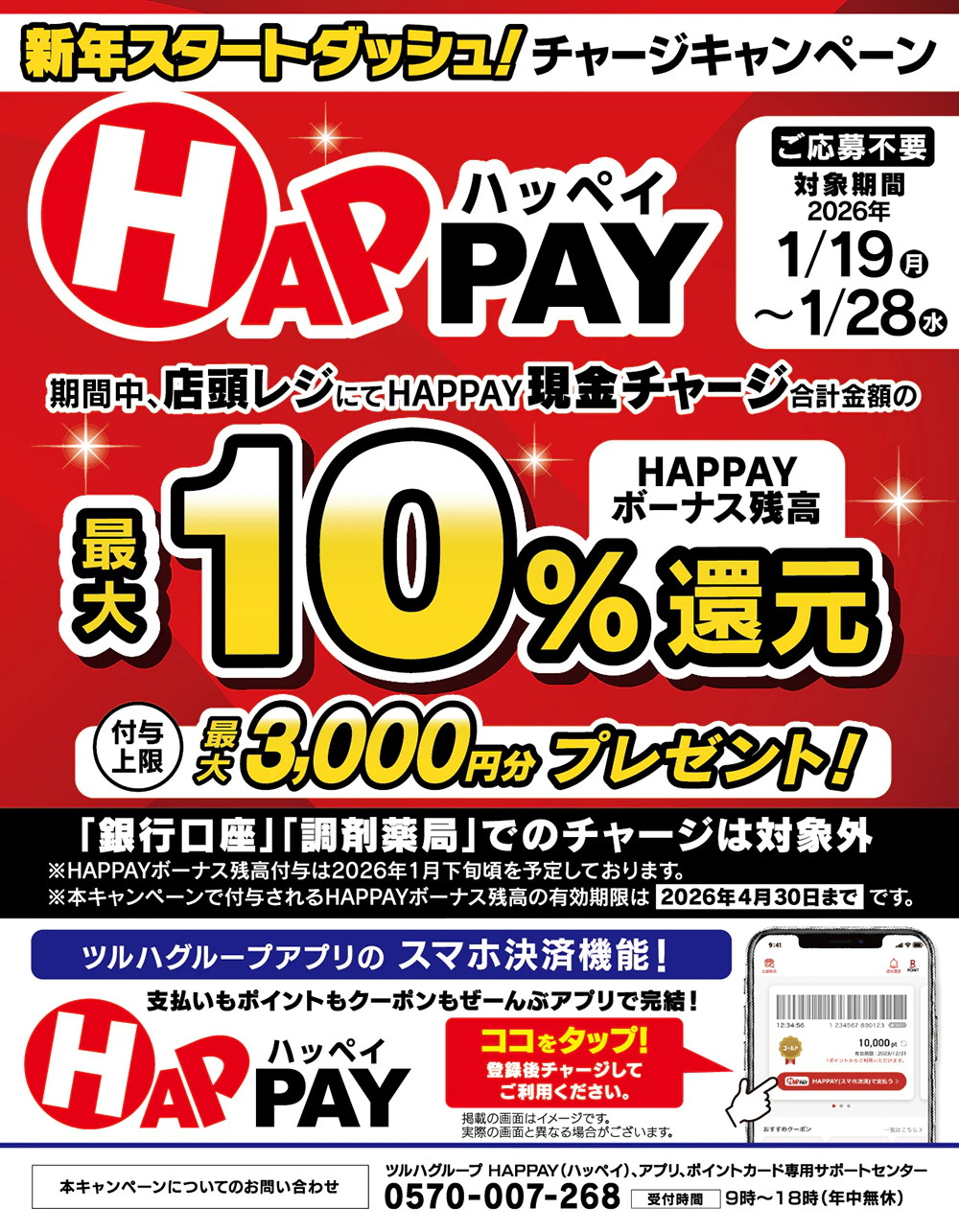 ・HAPPAYがご利用いただけるツルハグループ店舗でのHAPPAY店頭現金チャージが対象になります。