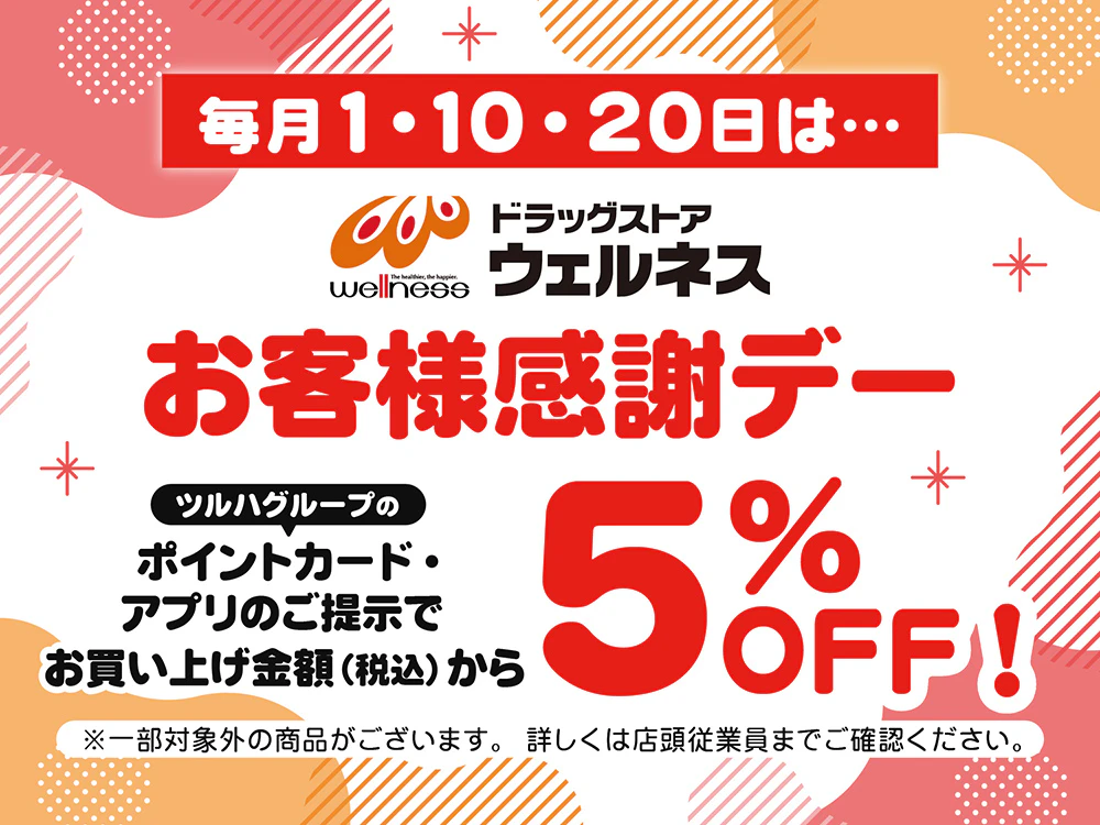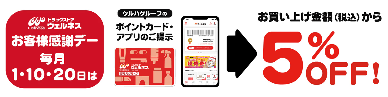 毎月1日・10日・20日の「お客様感謝デー」に、ツルハグループポイントカードまたは公式アプリをレジにてご提示いただくと、お買い上げ額(税込)から5%割引になります。